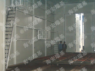 干式噴漆房的室體以鋼結構支架壁板和玻璃墻板于一體,室體前端設有工件進出通道,側面設有大型采光玻璃窗,室內寬敞明亮。室體的上部設有被動進風過濾層,使空氣按層流狀態均勻的進入噴漆室內。室體頂部的終效過濾層由一塊塊過濾板組合而成,在噴漆室頂部可以很方便地拆裝和清理。